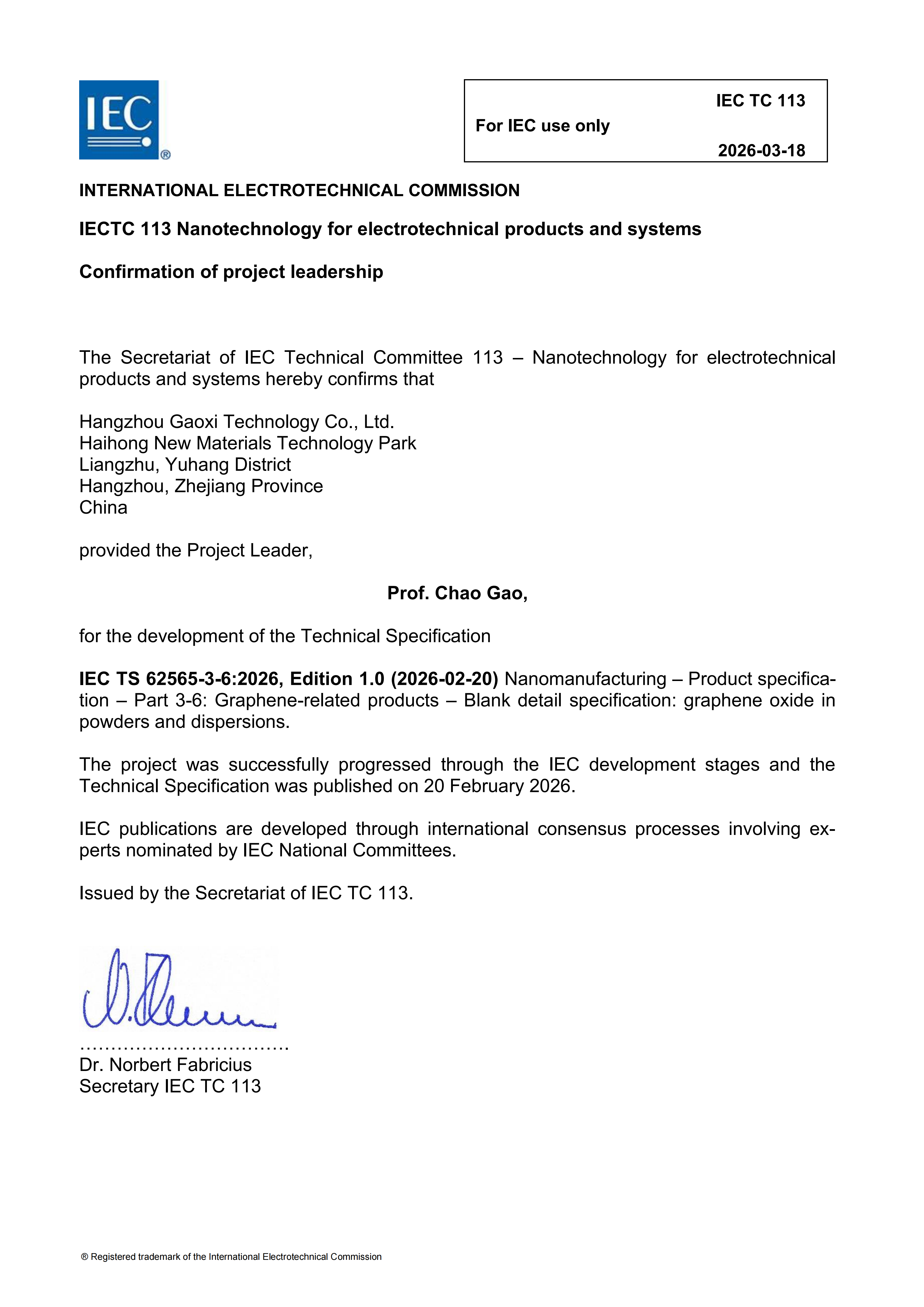 Recently, IEC TS 62565-3-6:2026, an International Electrotechnical Commission (IEC) standard led by Professor Gao Chao, founder and Chief Scientist of Gaoxi Technology, and Qiushi Distinguished Professor at the Department of Polymer Science and Engineering, Zhejiang University, has been officially published.