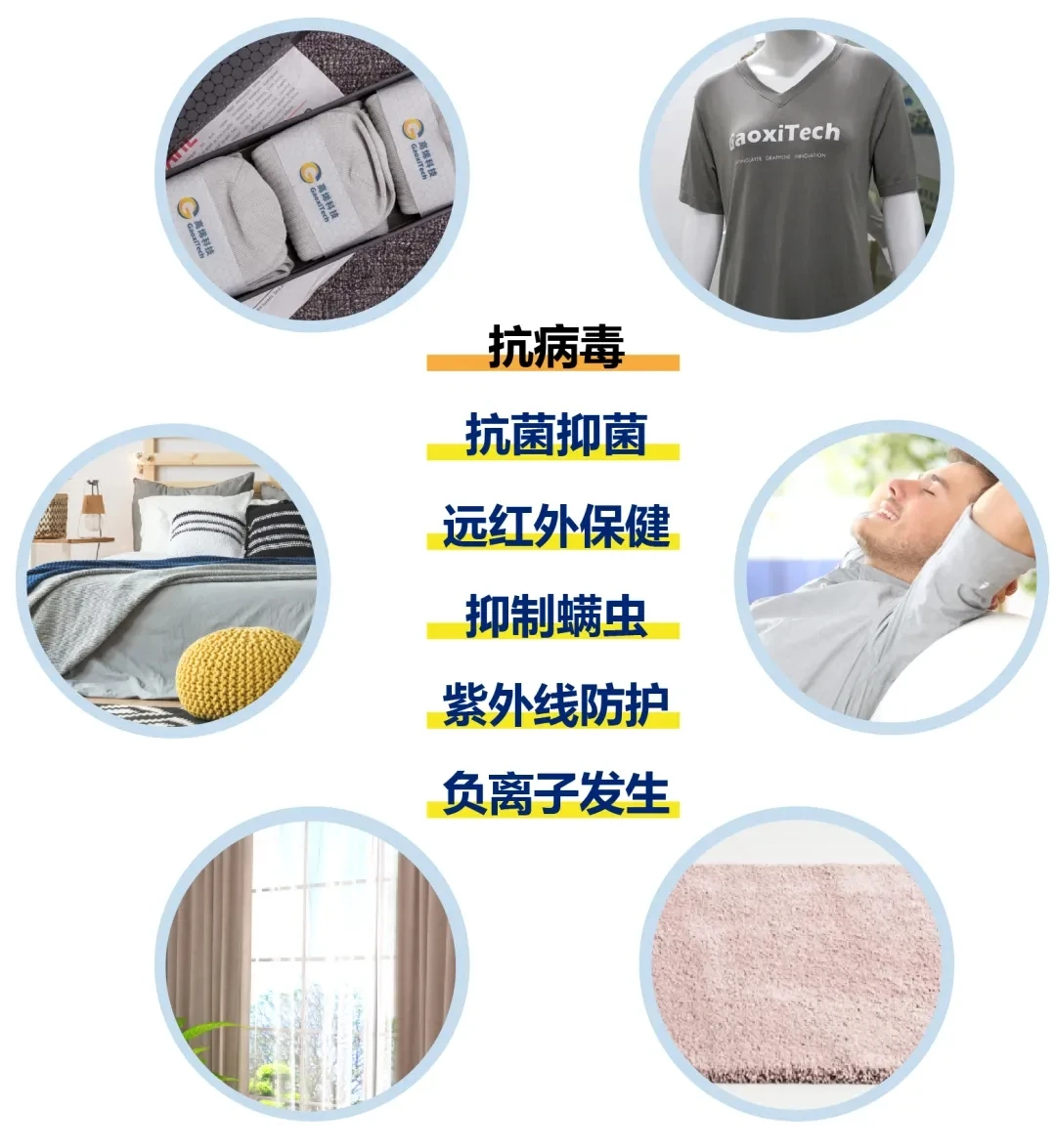 纤维及面料兼具六大功能:抗菌抑菌、抗病毒、远红外内暖、负离子发生、防紫外、抗螨虫等等。可根据需要进行定制化生产。