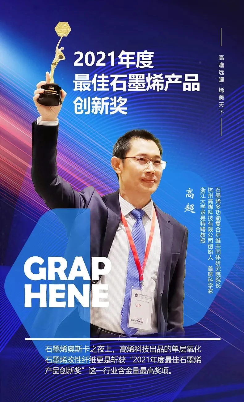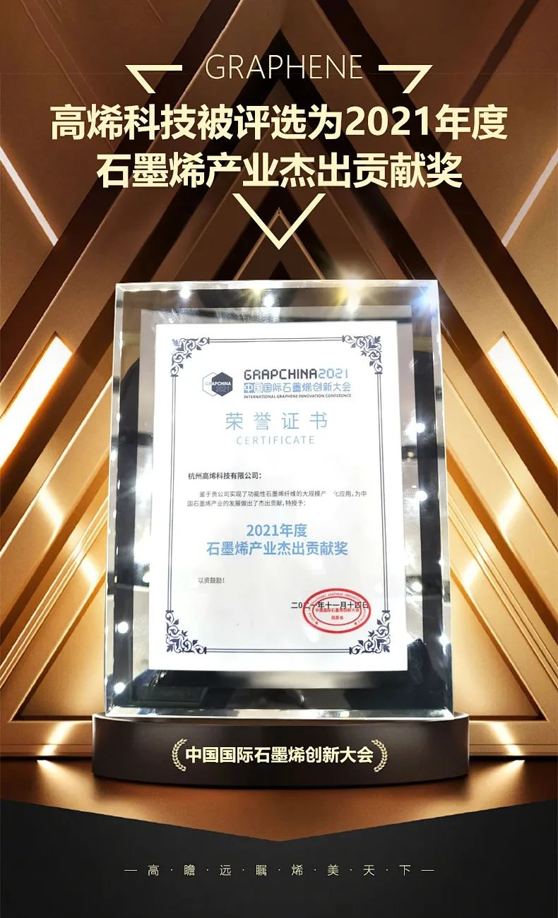 2021年,高烯科技凭借着自主研发生产的单层石墨烯多功能复合纤维,在中国国际石墨烯创新大会上战胜了战胜了法国的石墨烯智能创可贴、英国的手持式生物蛋白传感器、西班牙的石墨烯生物传感器,一举夺得了被誉为石墨烯领域奥斯卡奖的“2021年度最佳石墨烯产品创新奖”,企业荣获“2021年度石墨烯产业杰出贡献奖”。