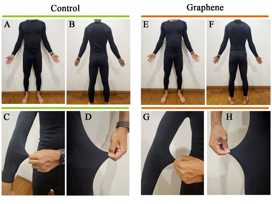 图2:对照组(A-D)与石墨烯组(E-H)服装对比示意图。图A、B(对照组)与图E、F(石墨烯组)分别展示了长袖压缩上衣与压缩长裤的正反面整体外观;图C与图G呈现了两组衬衫袖口的紧束性与弹性特征;图D与图H则分别演示了对照组与石墨烯组压缩裤腿的紧致度与延展性能。