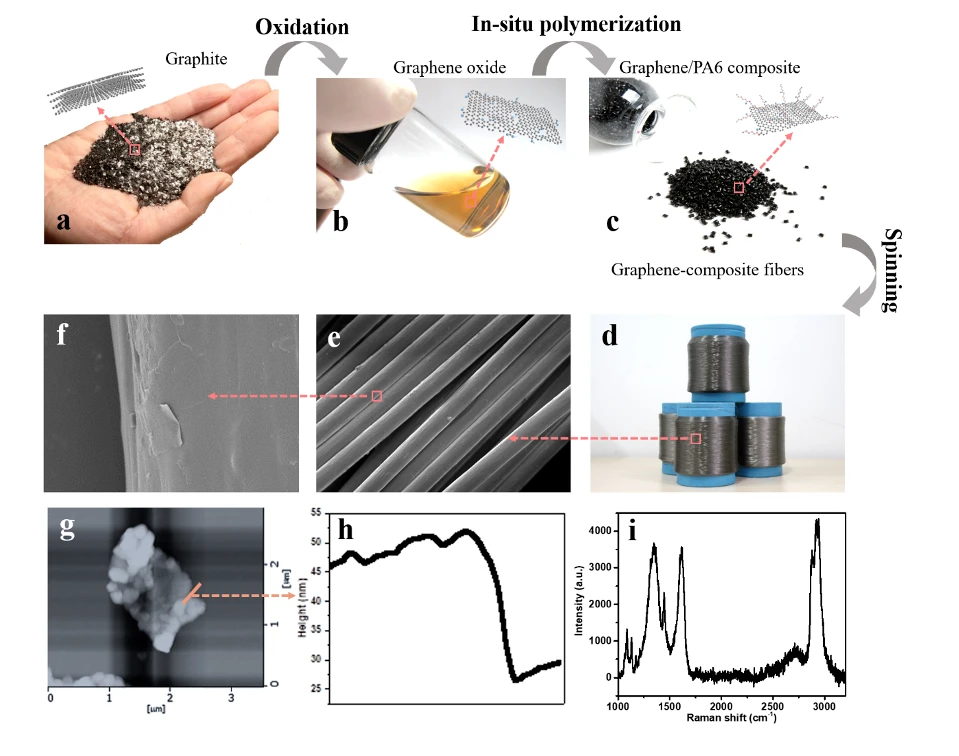 图4:石墨(a)经过氧化反应生成单层氧化石墨烯(b),随后通过原位聚合反应制得石墨烯复合尼龙6(或聚酯)母粒(c),最终经纺丝工艺形成石墨烯复合纤维(d)。扫描电镜图像(e)显示所得纤维表面形貌光滑均匀,(f)为更高放大倍率的成像结果。原子力显微镜(g)高度测量中观察到明显台阶特征(h),证实了石墨烯与聚合物间形成的共价键连接。石墨烯复合纤维的拉曼特征峰谱图(i)。