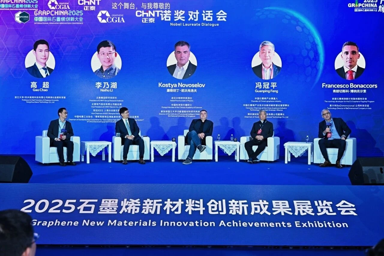 11月14日,浙江大学求是特聘教授、杭州高烯科技有限公司创始人兼首席科学家高超与2010年诺贝尔奖得主、石墨烯发现者之一康斯坦丁·诺沃肖洛夫,中国石墨烯产业奠基人、烯旺新材料科技股份有限公司董事长冯冠平,欧盟石墨烯旗舰计划路线图制定者、意大利国家研究委员会委员、意大利BeDimensional公司科技总监弗朗切斯科·博纳克尔索,正泰集团研究院院长、正泰电气副总裁李乃湖——五位来自全球学界与产业界的重量级人物首次同台,展开前沿理念与产业实践的深度碰撞。