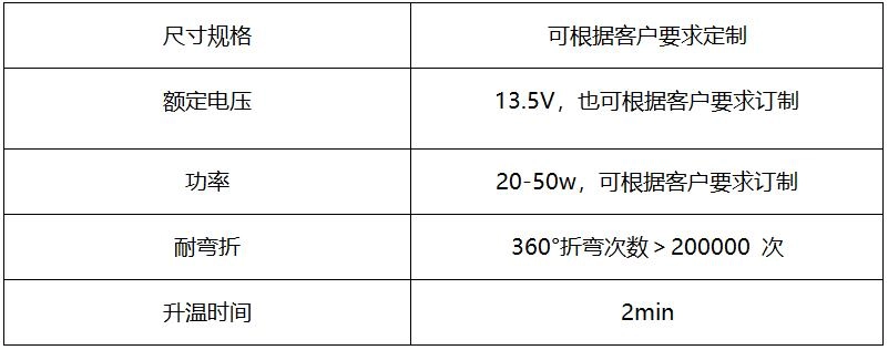 节能、升温快、发热均匀、安全环保、柔性耐弯折、具有远红外理疗功效。